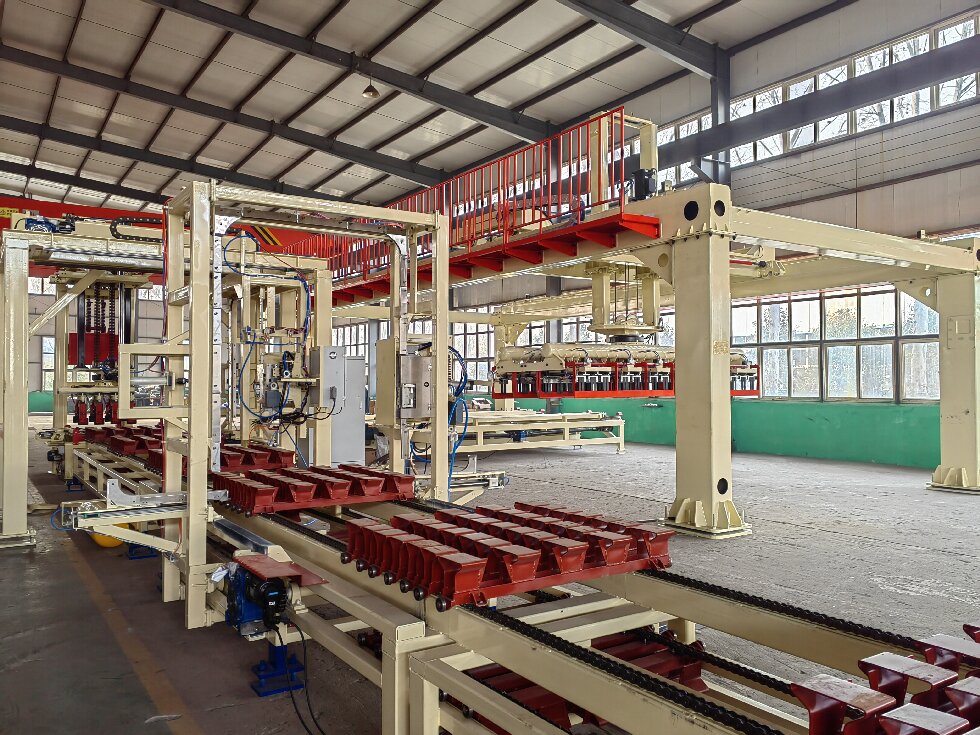 The“JuXiang” fully automatic brick unloading and baling machine is based on thesemi-automatic baler, which has carried out technological innovation and isequipped with an automatic brick unloading system. The system adopts theprinciple of the company's automatic setting machine and consists of lifting,translation and rotation actions. The fixture of the brick unloading machinepicks up the bricks from the kiln cart and divides them into one grab ormultiple grab of the entire layer. After the translation action, it is placedon the assembly table, and then the baling system completes the grouping,palletizing, baling, and finally the forklift forks up for transportation to complete the entire brickunloading and baling process.